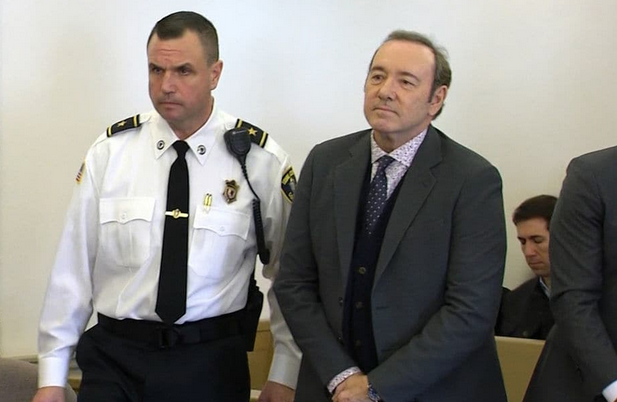 Kevin Spacey (right) making his first appearance in court
