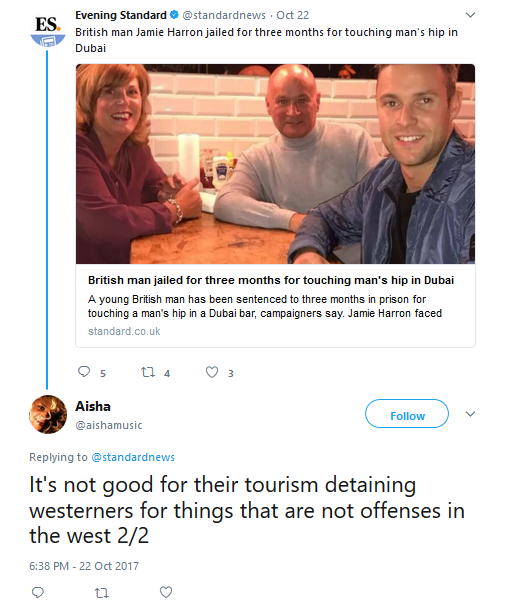 My tweet on Twitter prior to Harron's release After public outcry, the government of Dubai has changed its mind about Harron's incarceration and released him from jail. Prior to Harron's release, I stated on Twitter that his incarceration "is not good for their tourism" in Dubai. Two days later, the government of Dubai, namely His Highness Sheikh Mohammed bin Rashid Al Maktoum, also came to that conclusion and released him stating Harron's incarceration "could affect tourism." STORY SOURCE Brit jailed for three months Dubai for allegedly touching a man's hip in a bar in Dubai is 'released after 24 hours' Supporters of Jamie Harron claim the case against him has been dropped on orders from the Sheikh because 'it could affect tourism' 16:25, 23 OCT 2017 Updated16:26, 23 OCT 2017 - Jamie Harron was sentenced to three months in jail after allegedly touching a man's hip in a nightclub. The Briton sentenced to three months in a Dubai jail for allegedly touching a man's hip in a bar has been freed after just 24 hours, supporters said today. Jamie Harron, 27, was arrested for public indecency in July after the incident in a crowded nightclub where he claims he was trying to avoid spilling a drink. He was sentenced to three months in prison on Sunday - but campaigners claim the case against him has now been dropped on orders from the ruler of Dubai. Campaign group Detained in Dubai, who have been supporting Mr Harron, today announced he will now have his passport returned. A spokesperson said: "Jamie Harron is now on his way to the police station to retrieve his passport, apparently on order from His Highness Sheikh Mohammed bin Rashid Al Maktoum. "Jamie Harron was called by police that the case has been dismissed and he can pick up his passport and is free to leave." Mr Harron, an electrician from Stirling, Scotland, was stripped of his documents after his arrest been stranded abroad since. But Jamie's supporters claim the case has been dropped on orders from the Sheikh. Radha Stirling, CEO of Detained in Dubai, said Jamie was contacted by police last night to say his sentence had been overturned on order from the Sheikh. She said: "He nervously went to the police