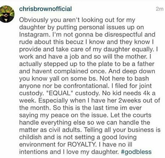 This week the site has been proven right, as tensions between Brown, 26 and 32-year-old Nia Amey, the mother of his child, have erupted in an ugly way, over her costly demands. This week Brown has finally taken the matter to a judge for the court to establish paternity, visitation and child support. Amey has been using these items in a bid to get more money and work her way into his life as his significant other. However, Brown’s heart is elsewhere (see: long suffering ex-girlfriend Karrueche Tran). Chris Brown upset about Amey's mother putting his businesses in the public domain: