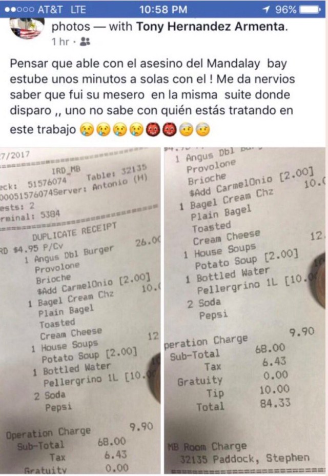 Stephen Paddock's dinner receipt for room service shows it was dinner for two Additionally, during a live press conference, authorities were queried as to why they thought the shooter was on one floor, when Paddock was actually on another. Police went to what was deemed the wrong floor first, then had to go up to the 32nd floor, where they found Paddock dead. Was a second shooter running away on the lower floor, as hotel guests are claiming. Somebody is lying in all of this and past experience tells us, it's usually the CIA and the FBI.