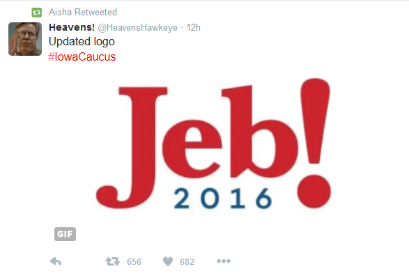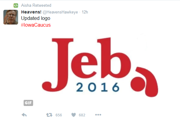 Jeb Bush spent the most amount in Iowa, $15,000,000, but received one of the lowest percentage of votes (3%). Please see the June 16, 2015 article: Jeb Bush Is Running For President But Has The Bush Family Really Been Good For America And The World. Side Bar: Never let the internet see you fail (LOL). Presidential candidate, Jeb Bush, brother of former U.S. President, George W. Bush, was the recipient of the most cutting tweet of the night on Twitter.com, when his logo that contained an exclamation point was turned into a flaccid penis (I laughed at this so much my stomach started to hurt LOL):