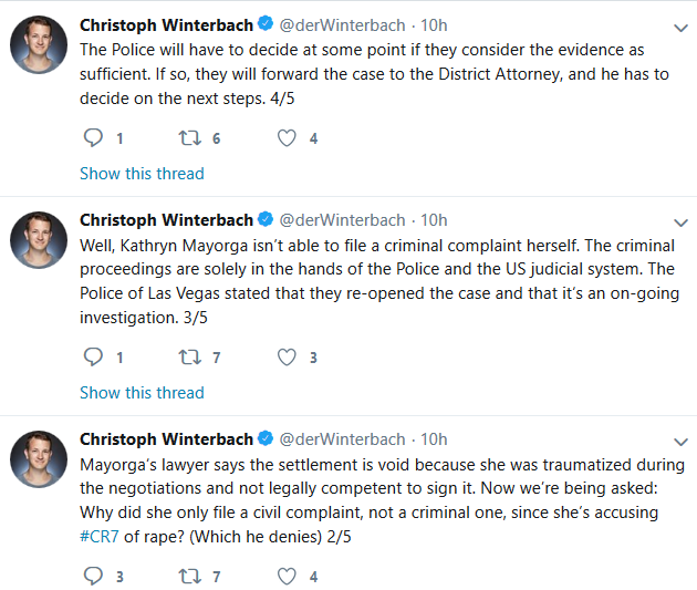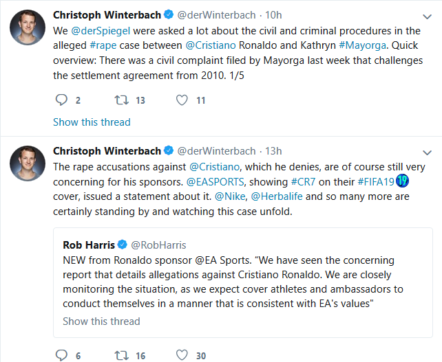 Der Spiegal journalist Christoph Winterbach tweeting about the case In 2005, Ronaldo was the subject of similar rape allegations. A woman went to police in London and made a complaint that Ronaldo and others raped her in a hotel room, in what became known as “roasting.” Police stated they were unable to obtain sufficient evidence in the investigation to bring charges. STORY SOURCE Manchester United: footballers in spotlight 12:01AM GMT 19 Dec 2007 - The allegation of rape at a hotel where Manchester United held their Christmas party is the latest in a long line of alleged sex scandals linked to football. However, despite numerous accusations, no high profile player has been convicted. The most infamous scandal erupted in 2003 when a 17-year-old girl alleged she had been gang raped by footballers at the Grosvenor House hotel in central London. During the inquiry, the public was introduced to the term "roasting", which footballers were said to use to refer to a particular form of group sex. The Crown Prosecution Service concluded there was insufficient evidence to proceed against two Premiership players, Carlton Cole and Titus Bramble. In another case in 2004, unfounded allegations of sexual assault were levelled at three Leicester City players. Paul Dickov, Frank Sinclair and Keith Gillespie were accused of attacking three German women at a hotel in La Manga, Spain, but all charges were dismissed by the court. In 2005 the Manchester United star Cristiano Ronaldo was arrested and interviewed over an allegation of rape by a woman he allegedly met at London's Sanderson Hotel. The Crown Prosecution Service said there was insufficient evidence and Ronaldo told friends he was the victim of a "stitch-up"... RELATED ARTICLE |
