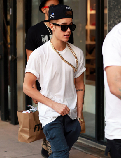 I have no words for this outfit... With photos surfacing of teen pop star Justin Bieber smoking weed at a party, claims he engaged in a threesome in another incident while high on marijuana and sizzurp and word from TMZ another set of marijuana photos could leak any day now exposing him smoking the drug in front of a house in Los Angeles, it's clear Bieber's security has been seriously compromised.