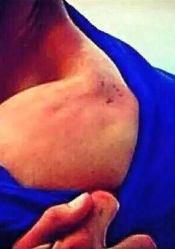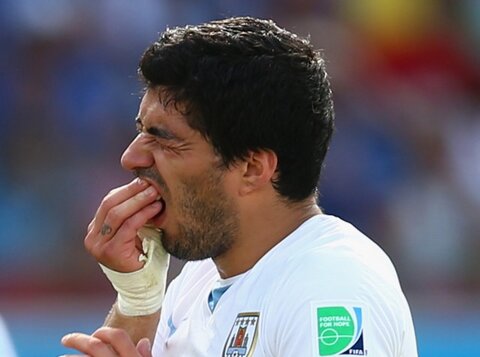 Painful bite marks on Giorgio Chiellini's shoulder However, the World Cup has not been without controversy. Uruguayan footballer, Luis Suarez, bit Italy's Giorgio Chiellini, then did a dive in an attempt at obtaining a (penalty) free kick (diving is why Suarez has so many goals to his name). The game was 0-0 and Suarez became so desperate he bit Chiellini with his famous buck teeth. Chiellini understandably recoiled in pain, dropping to the ground. This marks the third time Suarez has bitten someone on the pitch in what is undoubtedly unsportsmanlike conduct.