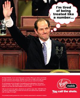 In other Eliot Spitzer news, Britain's Virgin Mobile has created a shameless, hilarious ad around the former governor’s troubles as "Client # 9" in the U.S. government's indictment against the Emperors Club prostitution ring: